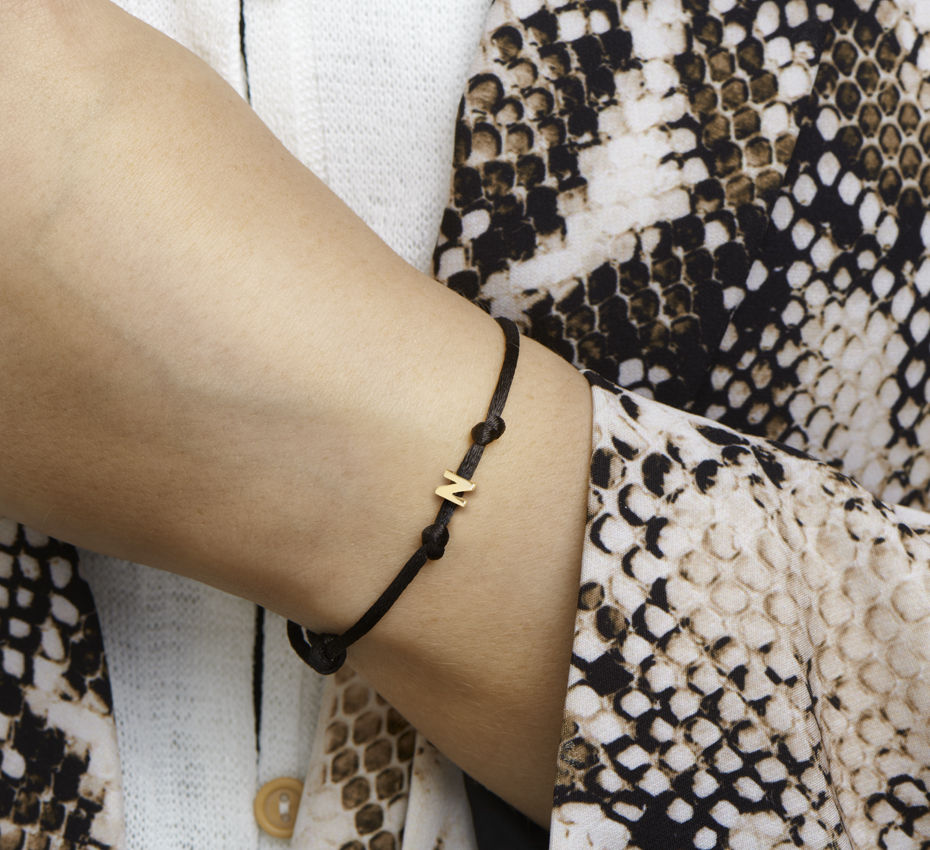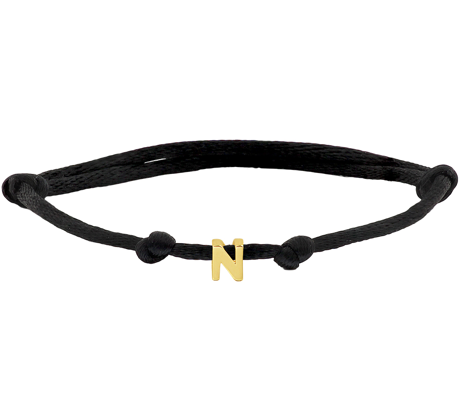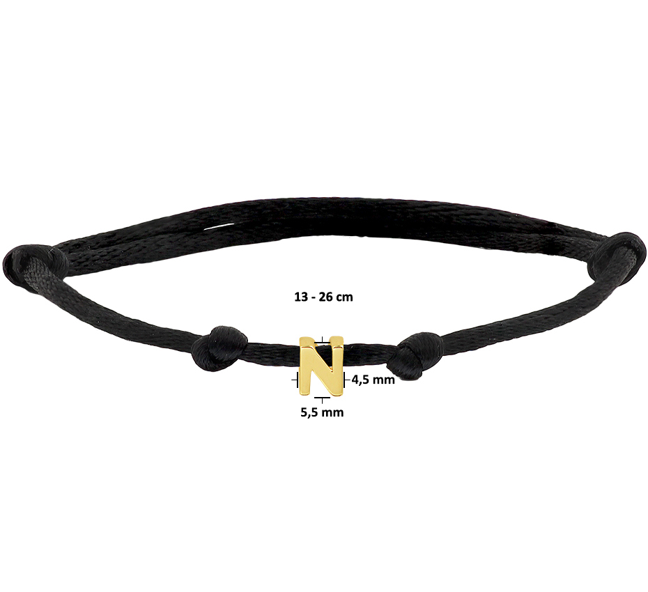 Zwart gevlochten armband met 14 geelgouden letter naar keuze. Het armbandje is verstelbaar en heeft draaglengte van 11-19 cm. De afmetingen van de letter is ca. 5x5.5 cm.