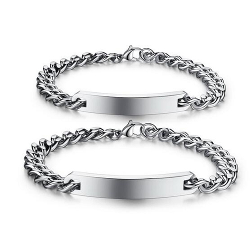 Set van twee hoogglans stalen plaatarmbanden. Deze luxe set bestaat uit één dames plaatarmband en één heren plaatarmband. De prijs is inclusief het graveren van uw eigen tekst van maximaal 20 tekens in de voorzijde van de armbanden. Optioneel kunt ook de achterzijde van de armbanden laten graveren. De tekst voegt u eenvoudig toe in de vervolgstappen.