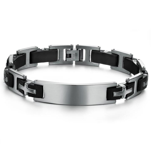 RVS plaatarmband met groffe schakels en zwarte kunststof delen. De armband is hoogglans afgewerkt. De plaat heeft het formaat 47x11mm. De armband heeft een lengte van 22cm. U kunt de armband ook in laten korten tot 20cm en 18cm. De verwijdere schakels voegen we in dat geval bij de armband zodat de armband altijd verlengd kan worden.
