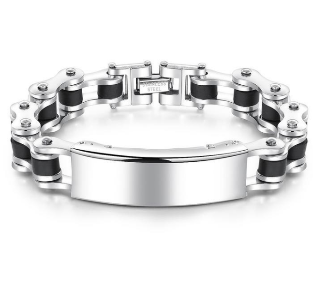 De stoere armband is voorzien van een RVS graveerplaat en sluiting. De schakels lijken op dat van een fietsketting.