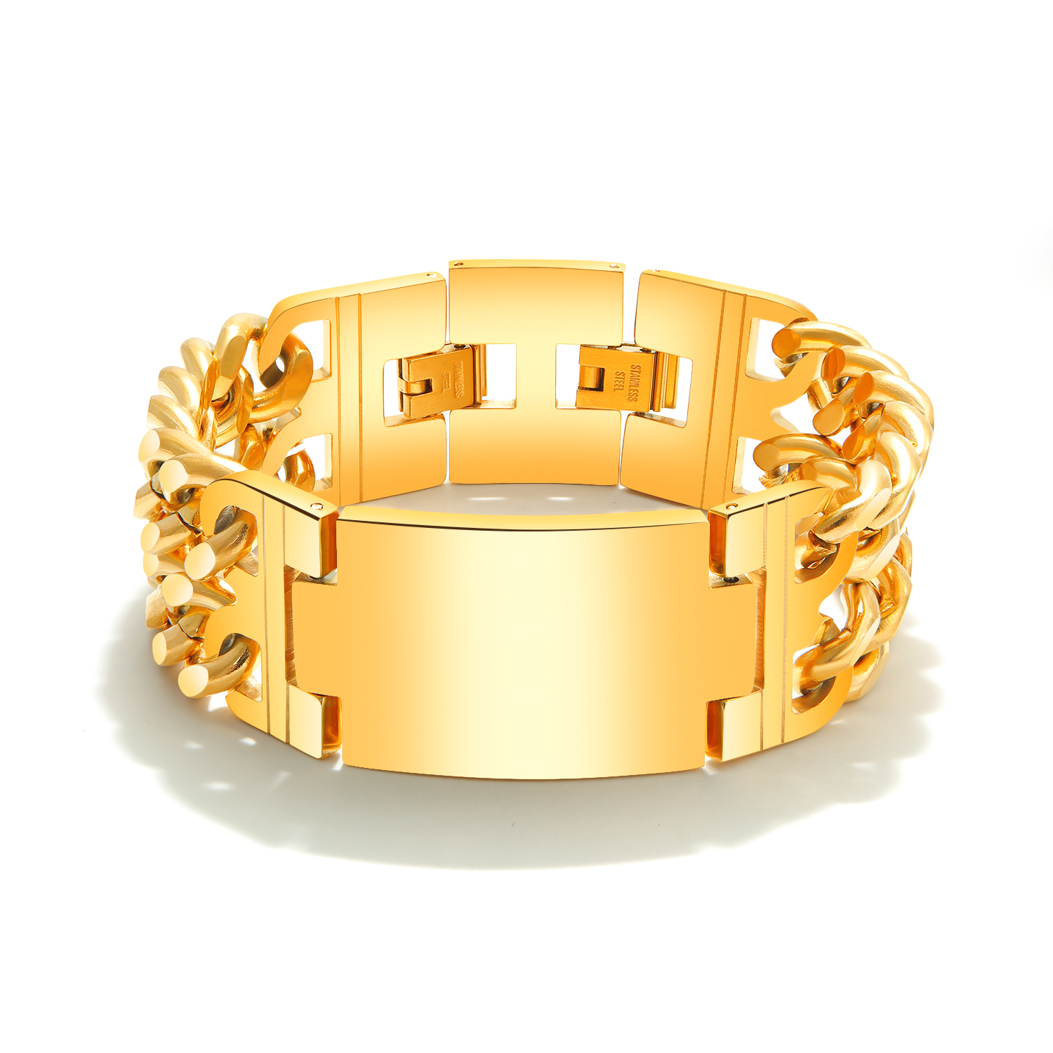 Stoere brede stalen armband in goud kelur met een plaat. De armband is 19cm lang. De armband is ook in de verstelbare lengtes 21cm en 23cm te bestellen, de armband wordt dan geleverd met losse schakels welke u tussen de armband kunt klikken. De armband is 22mm breed.