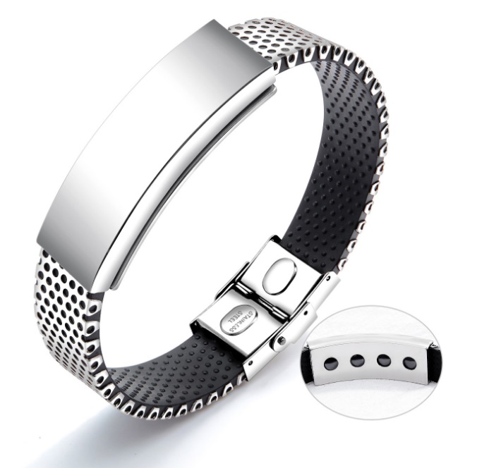 De stoere plaatarmband is voorzien van een RVS plaat en sluiting. Over de zwart rubberen band is een RVS laag aangebracht. De armband is 15mm breed en is te bestellen in diverse lengtes.