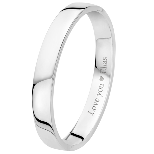 Deze stijlvolle vlakke zilveren bangle van 10mm breed is te personaliseren met een gravure aan de binnen- en/of buitenzijde. De armband wordt standaard aan de binnenzijde gegraveerd. Ook is het mogelijk om een vingerafdruk te laten graveren.