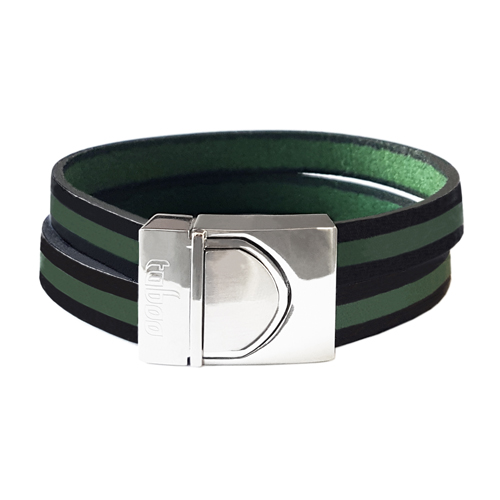 Quinn armband van het merk Taboo met twee Italiaanse lederen gestreepte banden in de kleurzen zwart en groen. De armband heeft een stevige edelstalen sluiting van 2,5cm breed en is verkrijgbaar in de lengtes 19 tot en met 23cm.