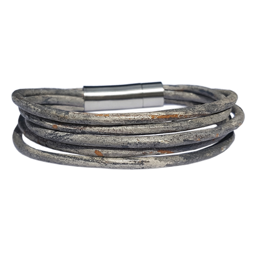 Vintage grijs leren Taboo armband model Barry met vijf leren bandjes. De armband heeft een stevige edelstalen sluiting van 8mm breed en is verkrijgbaar in de lengtes 17 tot en met 23cm.