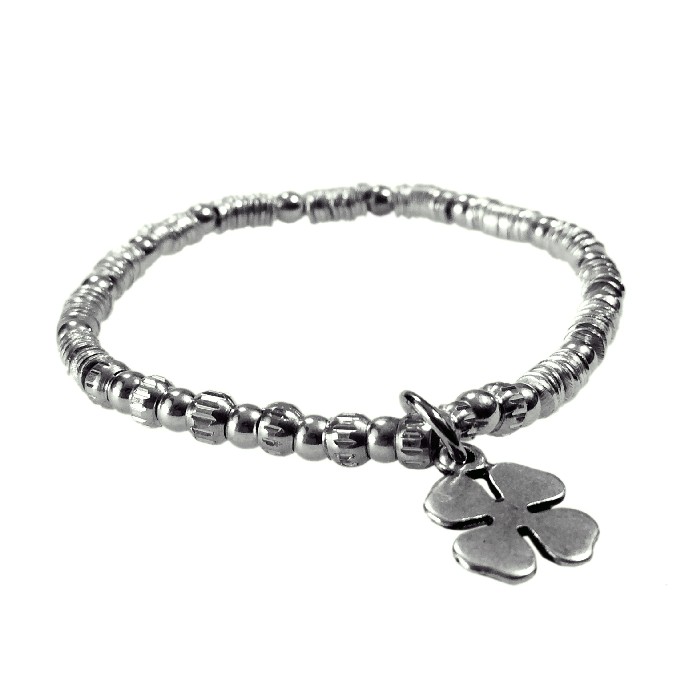 De armband is voorzien van 4mm brede kraaltjes en een bedeltje in de vorm van een klavertje vier.