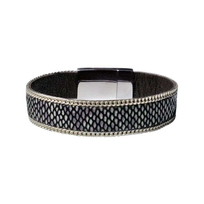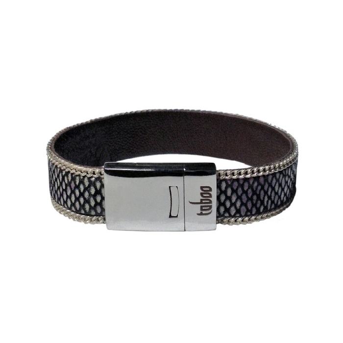 Armband van het merk Taboo met practig zacht leder met slangenprint in de kleur paars. Deze mooie armband heeft kettingkejs aan de zijkant, is 13mm breed en is 19cm lang. De armband heeft een platte RVS sluiting met een stevige magneet.