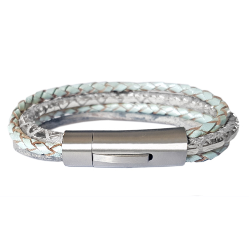 Leren damesarmband van het merk Taboo. De armband bevat vier leren banden in de kleuren mint, grijs en zilver. Twee van de vier banden zijn gevlochten. De edelstalen sluiting is 8mm breed en is mat afgewerkt. De armband is verkrijgbaar in de lengtes 17 tot en met 23cm.