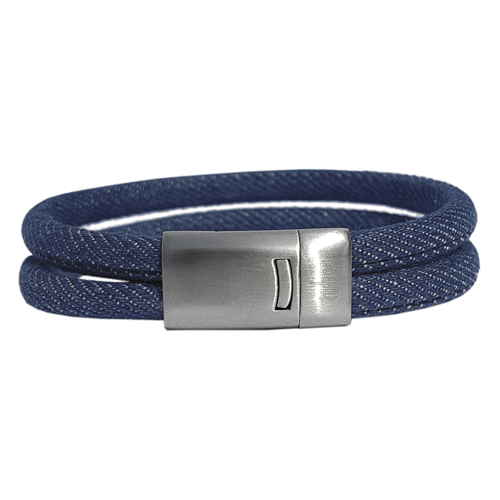 Taboo jeans armband Peter met twee jeansblauwe banden. De armband heeft een stevige edelstalen sluiting van 12mm breed en is verkrijgbaar in de lengtes 17 tot en met 23cm.
