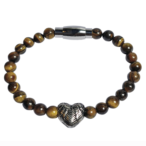 As armband met tiger eye kralen. In het hartje zit een askamer verwerkt. U kunt de askamer eenvoudig zelf vullen of dit door ons laten doen. Indien u voor deze laatste optie kiest, ontvangt u de instructies voor het (aangetekend) toesturen van de as na plaatsing van uw bestelling. De magneetsluiting is gemaakt van RVS en heeft een glanzend afwerking.