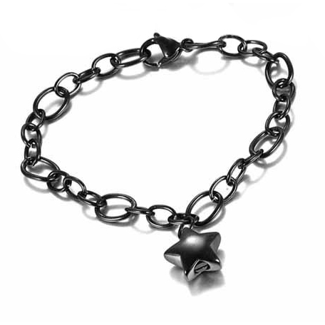 Zwarte RVS armband met een ster bedeltje van 14 mm waarin een beetje as gedaan kan worden. De armband heeft een lengte van maximaal 21,5 cm en heeft schakels van 4 mm dik. Door het subtiele design van de armband past deze bij iedere outfit en zal niemand direct vermoeden dat in de armband een beetje as van uw dierbare is verwerkt.