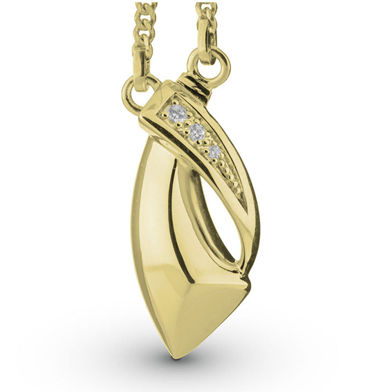 Een elegant en modern sieraad voor iedere dag. Deze gouden ashanger met drie prachtige stenen naar keuze is een mooie en eigentijdse manier om de herinnering aan uw dierbare op discrete wijze altijd bij u te dragen. De ashanger is op het eerste gezicht gewoon een mooie design hanger, maar bevat een onopvallend askamertje dat gevuld kan worden met de as van die ene bijzondere persoon. Zo creëert u een zeer persoonlijk en uniek aandenken. De gouden ashanger is 31 millimeter groot, kan vervaardigd worden uit 14 karaats geelgoud of witgoud en bevat een gouden ketting van 45cm. Laat de ashanger graveren met een tekst naar keuze.
