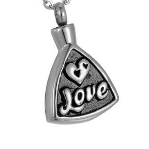 De RVS ashanger in de vorm van een driehoek heeft aan de voorzijde een hart met twee kleine hartjes en de tekst "Love". De schroefdop van de ashanger bevindt zich aan de bovenzijde.