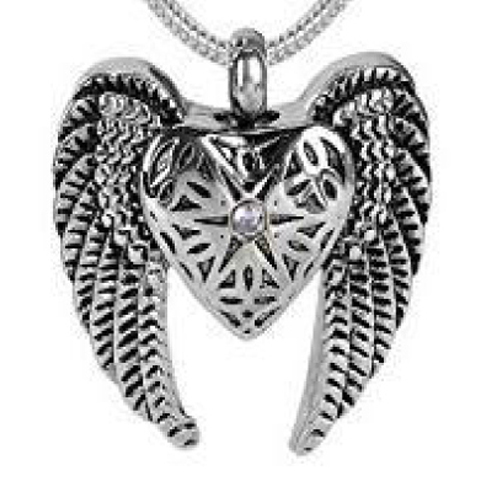 RVS ashanger engelenvleugels met een hart, in het midden van het hart zit een lila steentje. De ashanger heeft het schroefdopje aan de bovenzijde.