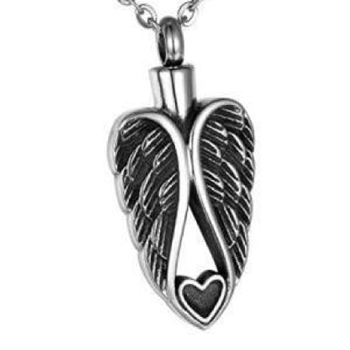 RVS ashanger engelenvleugels met daartussen een zwart hartje. De ashanger heeft het schroefdopje aan de bovenzijde.