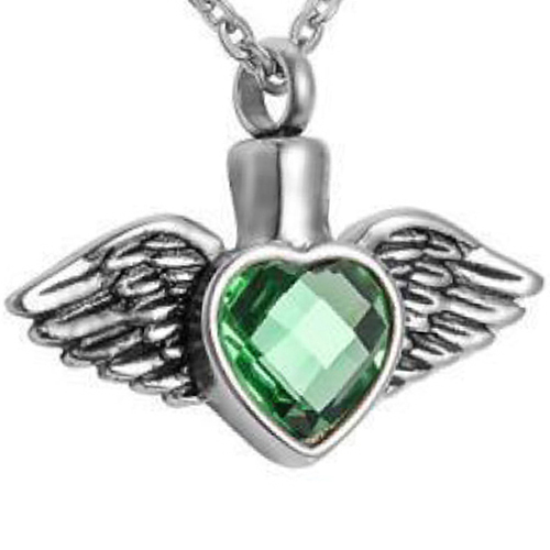 RVS ashanger hart met een groen steentje en engelenvleugels waarbij de schroefdop aan de bovenzijde zit.