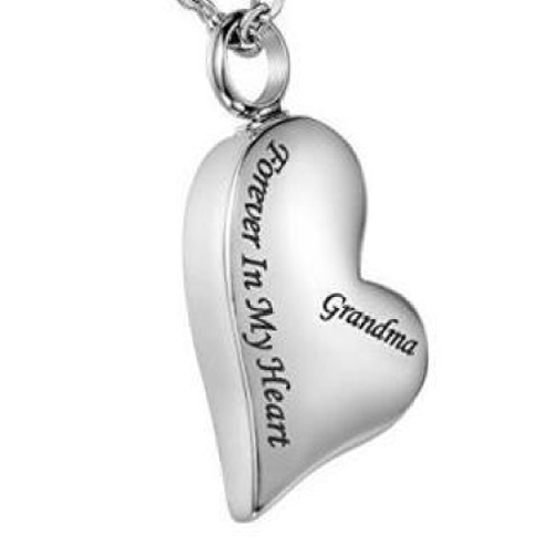 RVS ashanger hart met een schroefdopje aan de bovenzijde. De ashanger bevat de tekst 'forever in my heart gandma'.