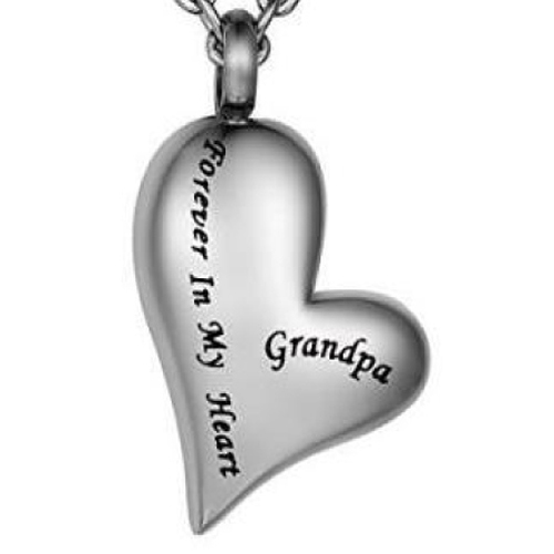 RVS ashanger hart met een schroefdopje aan de bovenzijde. De ashanger bevat de tekst 'forever in my heart gandpa'.