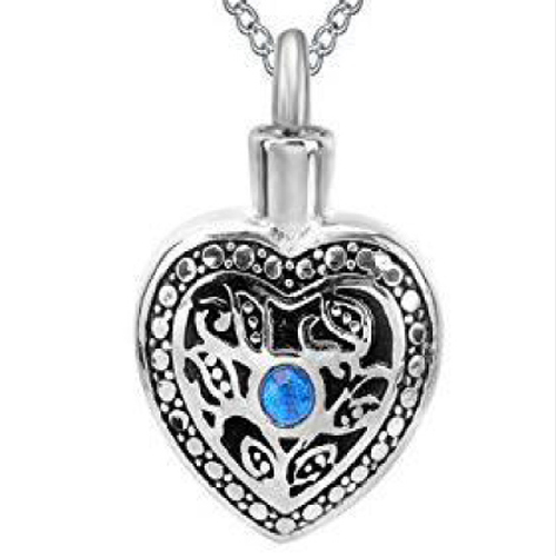 RVS ashanger hart met blauw steentje en een schroefdopje aan de bovenzijde. De ashanger bevat de tekst 'Always in my heart'.