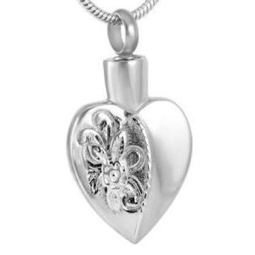 RVS ashanger hart met aan de linkervoorzijde een bloem. De schroefdop van de ashanger bevindt zich aan de bovenzijde.