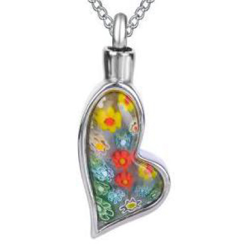 Langwerpige RVS ashanger in de vorm van een hart met bloemen, waarbij het schroefdopje aan de bovenzijde zit.