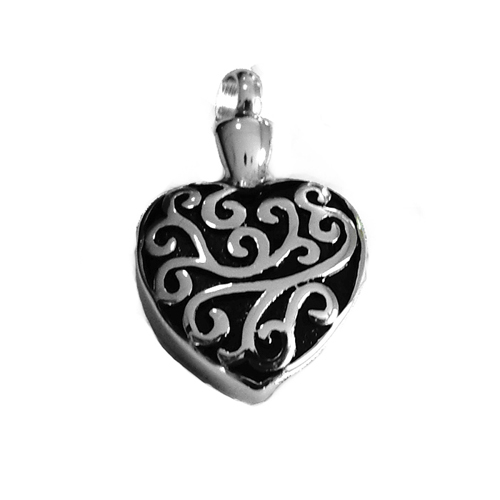 De RVS ashanger in de vorm van een hart, is aan de voorzijde zwart met sierlijke lijnen . De schroefdop van de ashanger bevindt zich aan de bovenzijde.