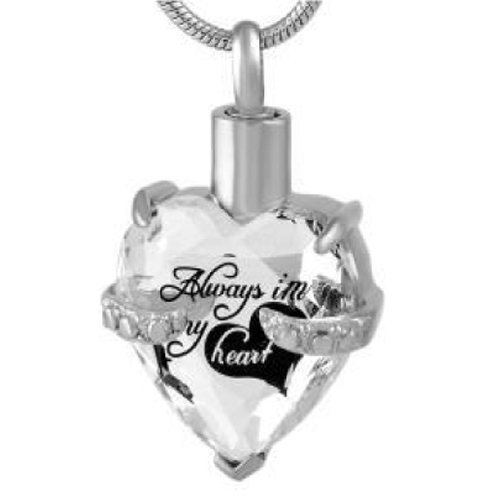 RVS ashanger hart met aan de voorzijde een heldere steen in de vorm van een hart met de tekst "Always in my heart" en een hartje. De schroefdop van de ashanger bevindt zich aan de bovenzijde.
