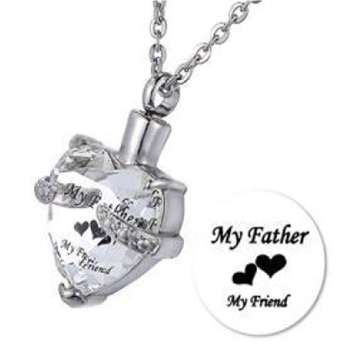 RVS ashanger hart met aan de voorzijde een heldere steen in de vorm van een hart met de tekst "My father my friend" en twee hartjes. De schroefdop van de ashanger bevindt zich aan de bovenzijde.