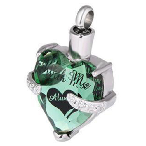 RVS ashanger hart met aan de voorzijde een mintgroene steen in de vorm van een hart met de tekst "With me always" en een hartje. De schroefdop van de ashanger bevindt zich aan de bovenzijde.