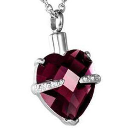 RVS ashanger hart met aan de voorzijde een paarse steen in de vorm van een hart. De schroefdop van de ashanger bevindt zich aan de bovenzijde.