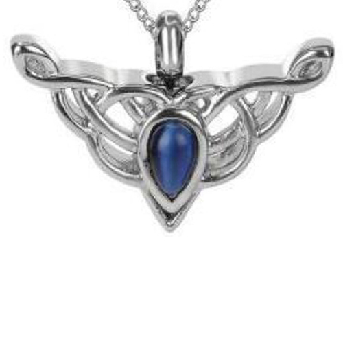 RVS ashanger met keltische uiterlijk en donkerblauwe steen, waarbij het schroefdopje aan de bovenzijde zit.