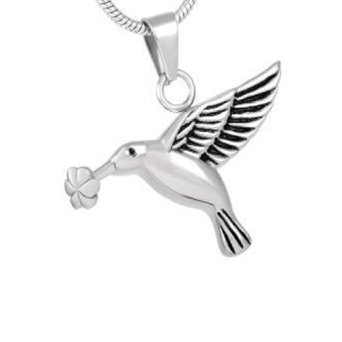 De RVS ashanger heeft de vorm van een kolibri met een bloemetje op het puntje van zijn snavel . De schroefdop van de ashanger bevindt zich aan de achterzijde.