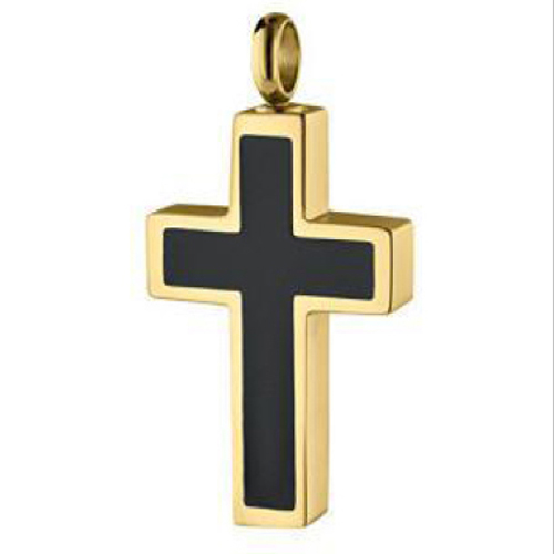 De goudkleurige RVS ashanger heeft de vorm van een kruis met op de voorzijde een ander zwart kruis. De schroefdop van de ashanger bevindt zich aan de bovenzijde.