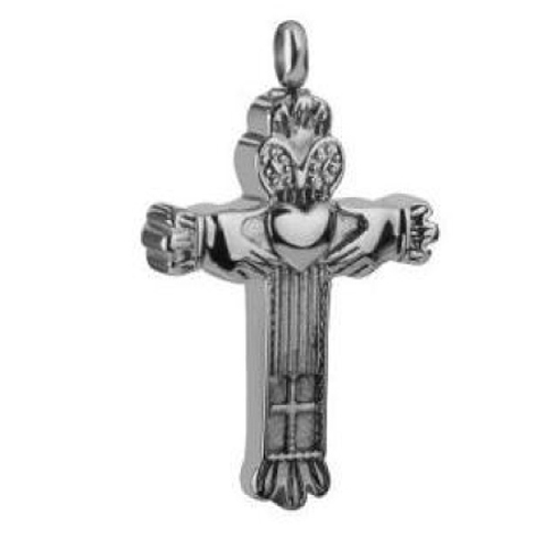 RVS ashanger kruis met sierlijke elementen aan de voorzijde zoals een hart en twee handen. De schroefdop van de ashanger bevindt zich aan de bovenzijde van de hanger.