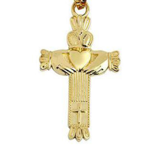 Goudkleurige RVS ashanger kruis met sierlijke elementen aan de voorzijde zoals een hart en twee handen. De schroefdop van de ashanger bevindt zich aan de bovenzijde van de hanger.