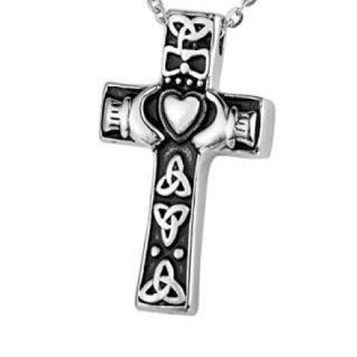 RVS ashanger kruis met sierlijke elementen aan de voorzijde zoals een hart en twee handen tegen een zwarte achtergrond. Door de bovenzijde van het kruis kan een ketting doorgevoerd worden.