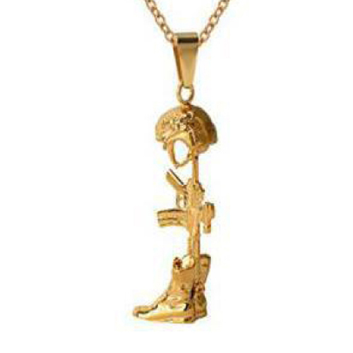 De goudkleurige RVS ashanger heeft een leger thema door gebruik van de helm, geweer en gevechtslaarzen. De schroefdop van de ashanger bevindt zich aan de onderzijde.