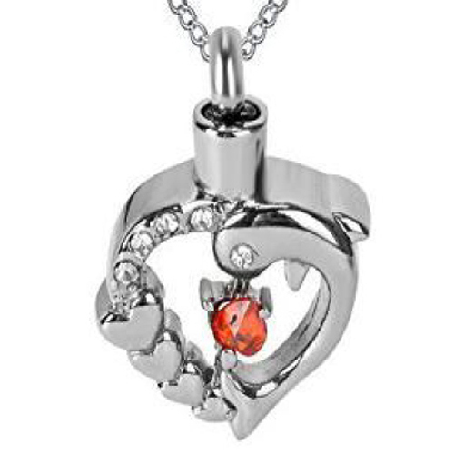 RVS ashanger open hart. Hartvormige ashanger waar een aantal steentjes, een dolfijn en een hartvormig rood steentje in zijn verwerkt.