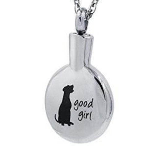 Ronde RVS ashanger met aan de voorzijde een afbeelding van een hond en de tekst "Good Girl". De schroefdop van de ashanger bevindt zich aan de bovenzijde.