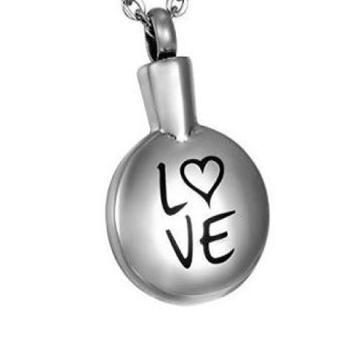 Ronde RVS ashanger met aan de voorzijde de tekst "Love" waarbij de O een hartje is. De schroefdop van de ashanger bevindt zich aan de bovenzijde.