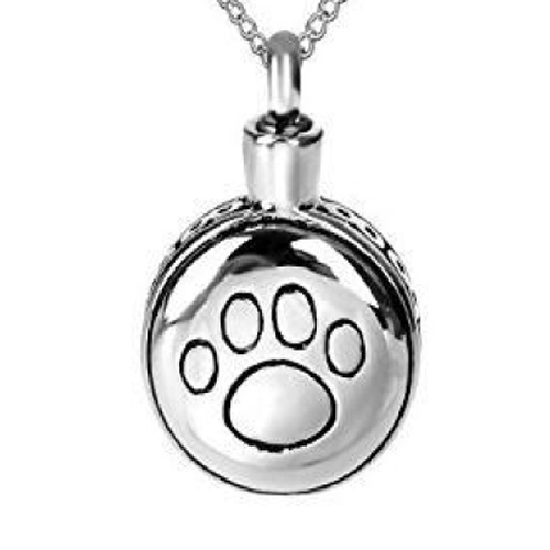 Ronde RVS ashanger met aan de voorzijde een pootafdruk. De zijkant is afgewerkt met infinity tekens. De schroefdop van de ashanger bevindt zich aan de bovenzijde.