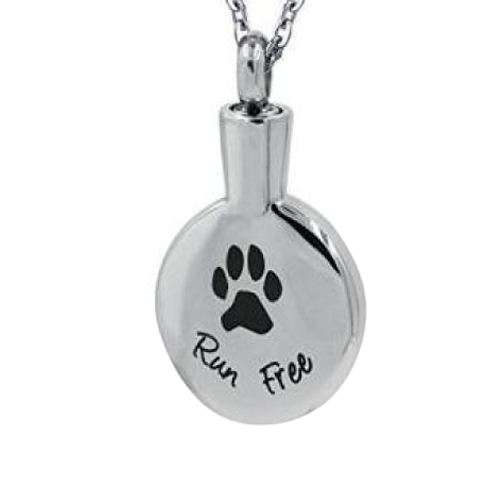 Ronde RVS ashanger met aan de voorzijde een pootafdruk en de tekst "Run Free". De schroefdop van de ashanger bevindt zich aan de bovenzijde.