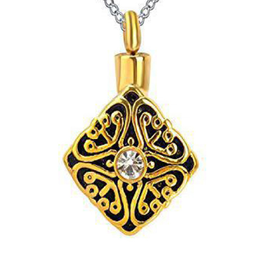 Ruitvormige goudkleurige RVS ashanger met aan de voorzijde sierlijke krullen met in het midden een wit steentje. De schroefdop van de ashanger bevindt zich aan de bovenzijde.