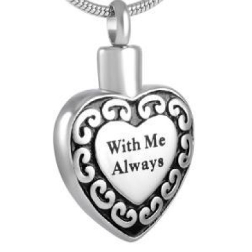 RVS ashanger hart met een schroefdopje aan de bovenzijde. De ashanger bevat de tekst 'With me always'.