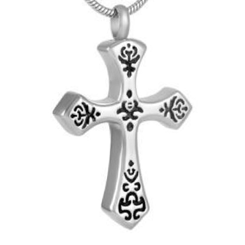 De RVS ashanger heeft de vorm van een Keltisch kruis met sierlijke versieringl. De schroefdop van de ashanger bevindt zich aan de bovenzijde.