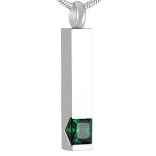 De staafvormige RVS ashanger heeft een groene steen. De schroefdop van de ashanger bevindt zich aan de bovenzijde.