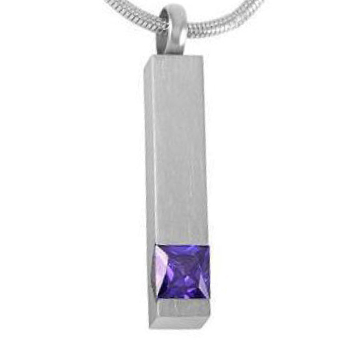 De staafvormige RVS ashanger heeft een paarse steen. De schroefdop van de ashanger bevindt zich aan de bovenzijde.
