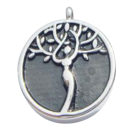 De ronde RVS ashanger heeft aan de voorzijde een zwart vlak waarop een vrouw is afgebeeld met takken als armen. De schroefdop van de ashanger bevindt zich aan de bovenzijde.