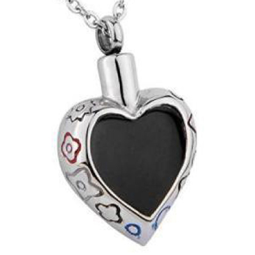 RVS ashanger zwart hart met een schroefdopje aan de bovenzijde. De ashanger heeft aan de voorzijde een groot zwart hart. De zijkanten van de ashanger zijn versierd met bloemen en rondjes.