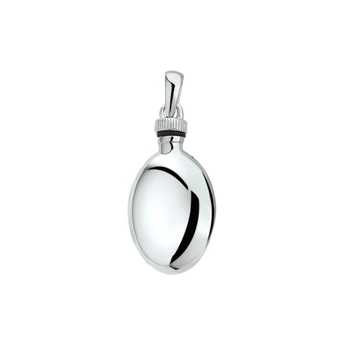 Deze ovale urnhanger is gemaakt van gerhodineerd zilver en hoogglans afgewerkt. De hanger heeft een afmeting van 14,5 mm bij 25 mm.